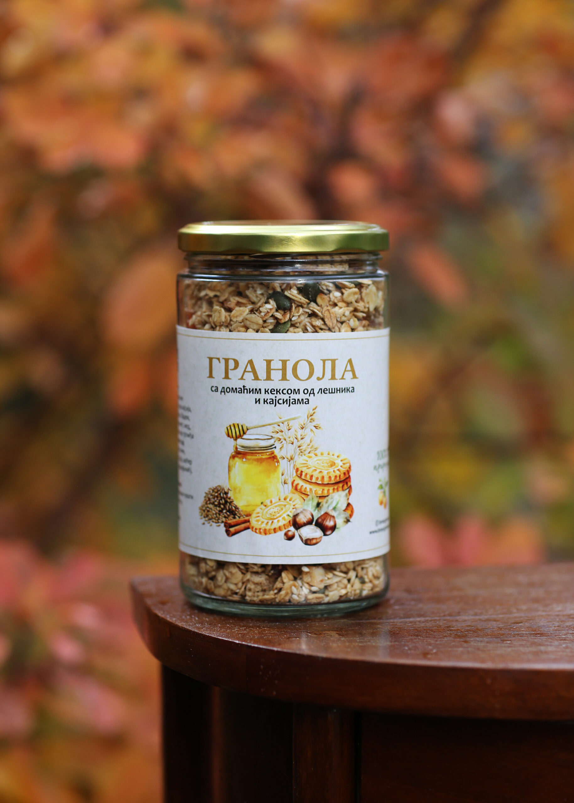 - Hrskava granola od organskih ovsenih pahuljica, sa komadićima domaćeg keksa od lešnika i osmotski sušenim kajsijama.
